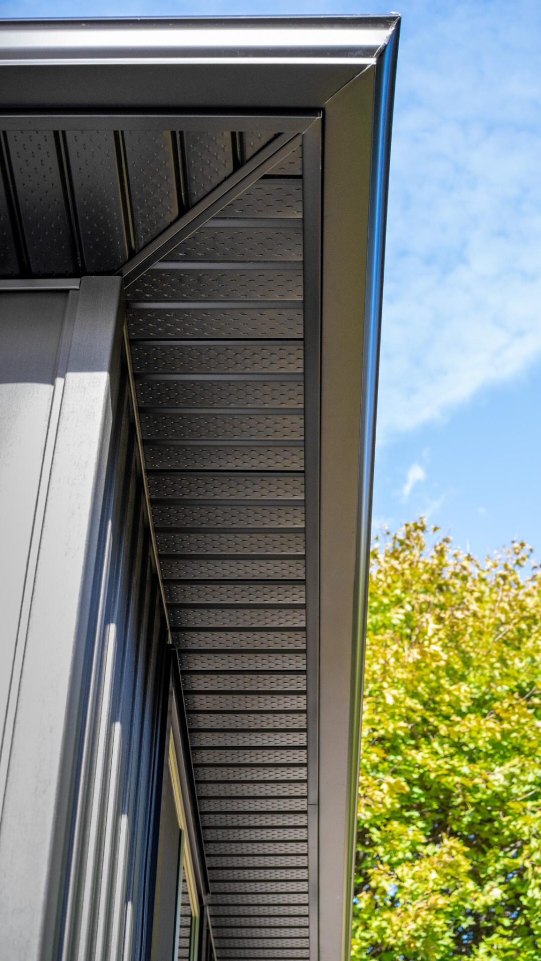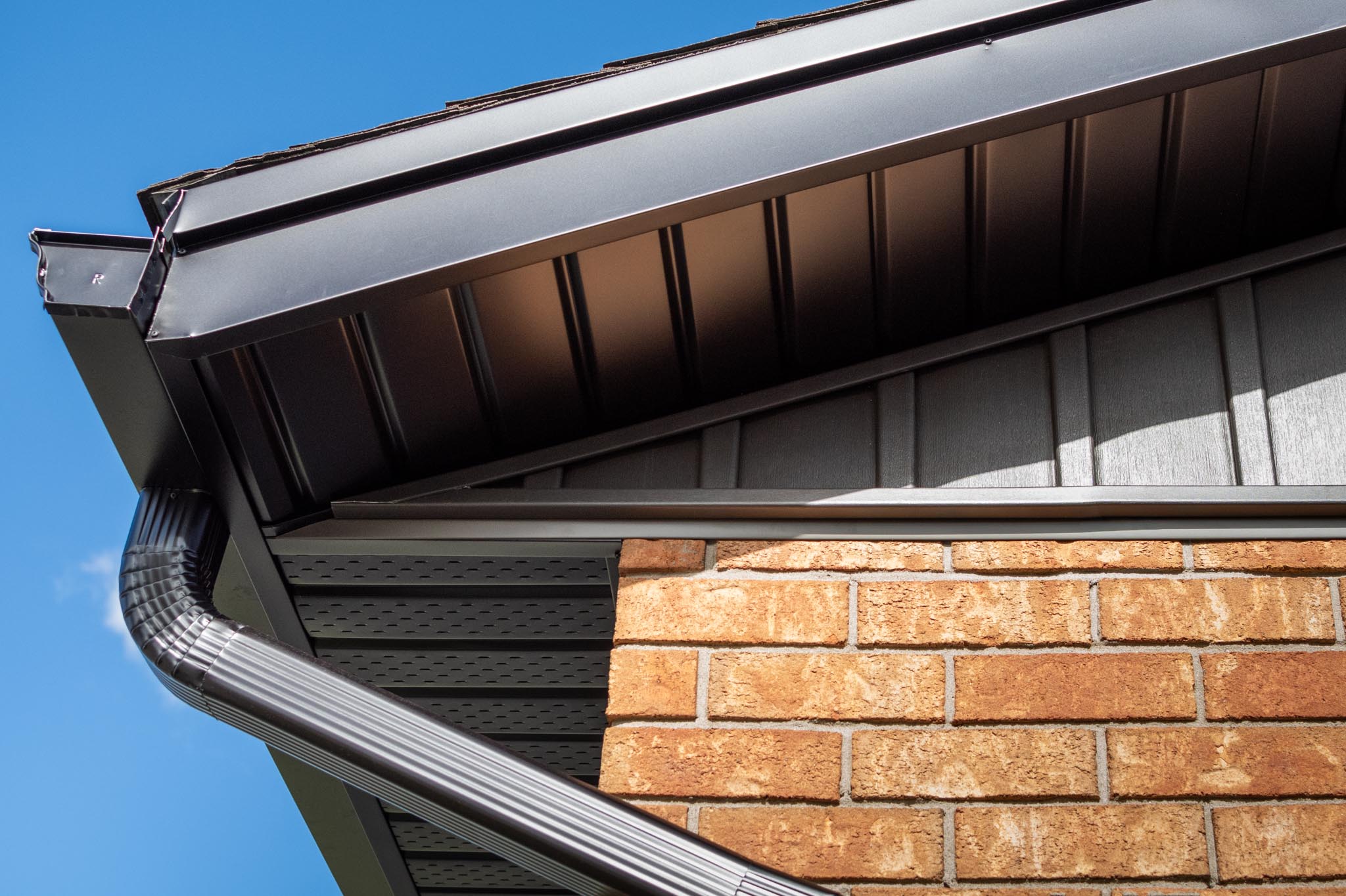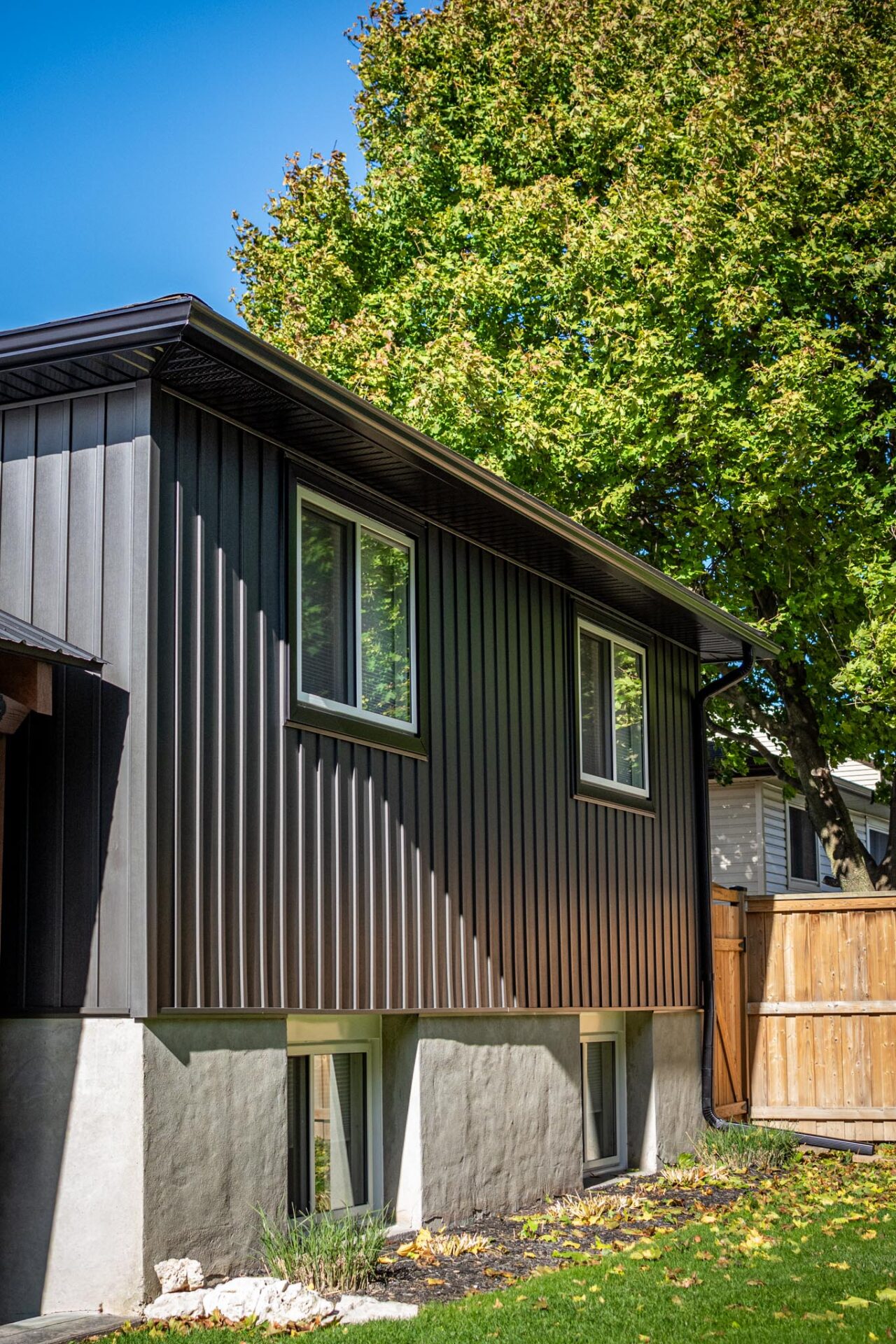 New soffit, fascia, eavestrough, gutter guard, and window and door cappings complete the exterior, tying everything together.