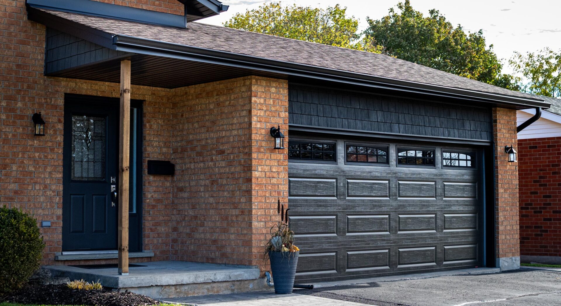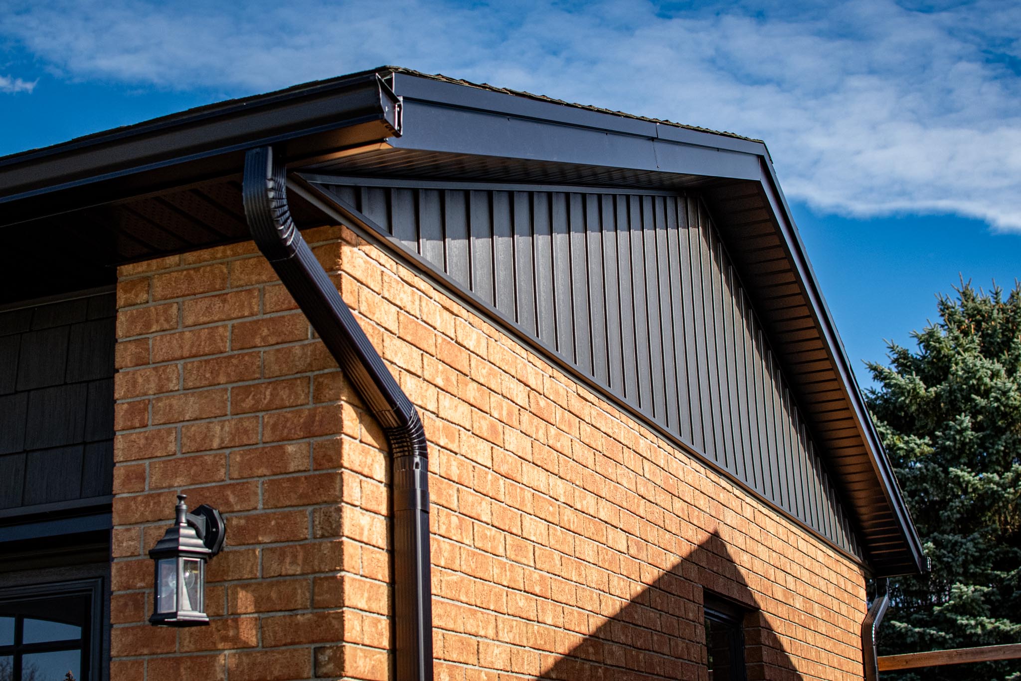 This home now features vinyl board and batten siding with shake accents that complement the existing brick and add depth and contrast.