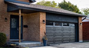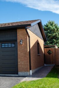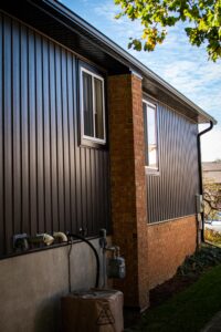 This Elmira home now features vinyl board and batten siding with shake accents that complement the existing brick and add depth and contrast.