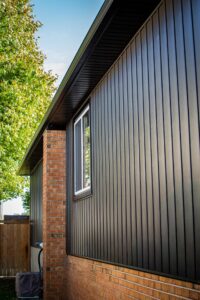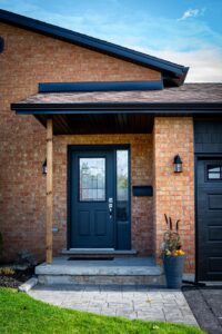 New soffit, fascia, eavestrough, gutter guard, and window and door cappings complete the exterior, tying everything together.